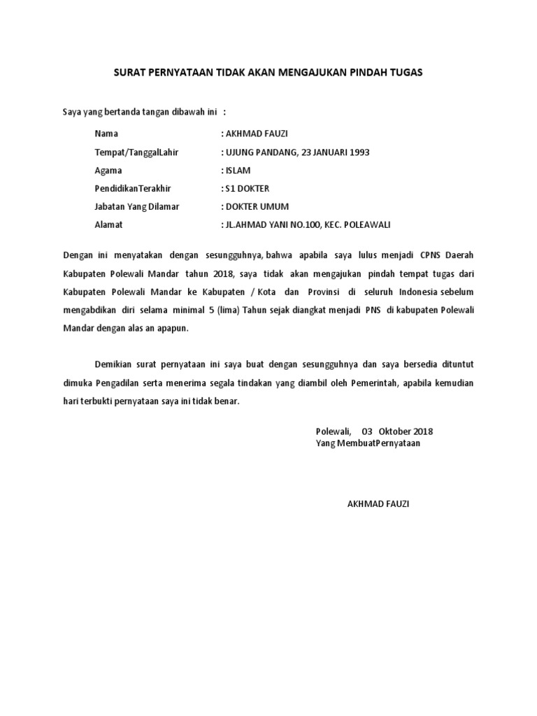 Contoh Surat Pernyataan Tidak Mengajukan Pindah Tempat Tugas Persyaratan Cpns